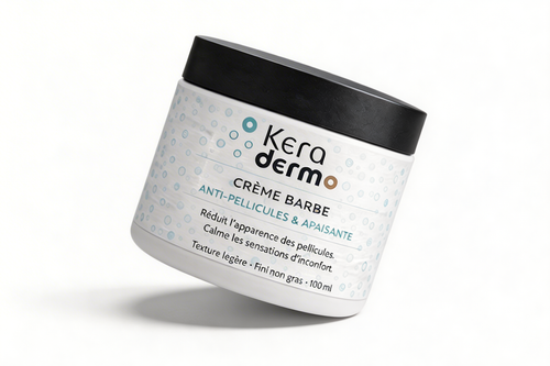 Keraderm est la crème quotidienne conçue pour éliminer la “neige” dans la barbe et calmer l’inconfort sous les poils. Texture légère, fini non gras : tu appliques, ça pénètre, et ta barbe redevient propre, nette et agréable à porter.
